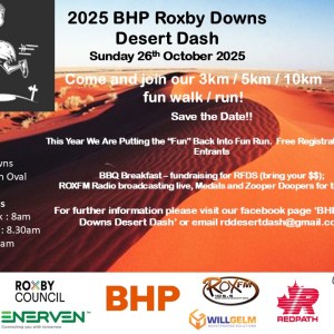 Roxby Downs BHP Desert Dash We are holding our annual fun run this October. 10km – 5km – 3km, run and walk events. healthy and... 26 Oct 8:00 am - 11:00 am