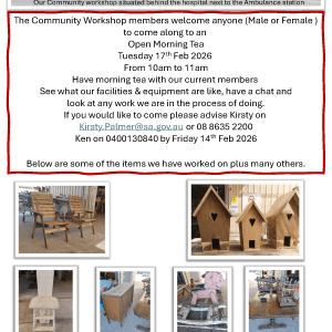 Port Broughton Community Workshop Open Morning Tea The Community Workshop members welcome anyone to come along to an ‘Open Morning Tea’ – have morning tea with current... 17 Feb 10:00 am - 11:00 pm