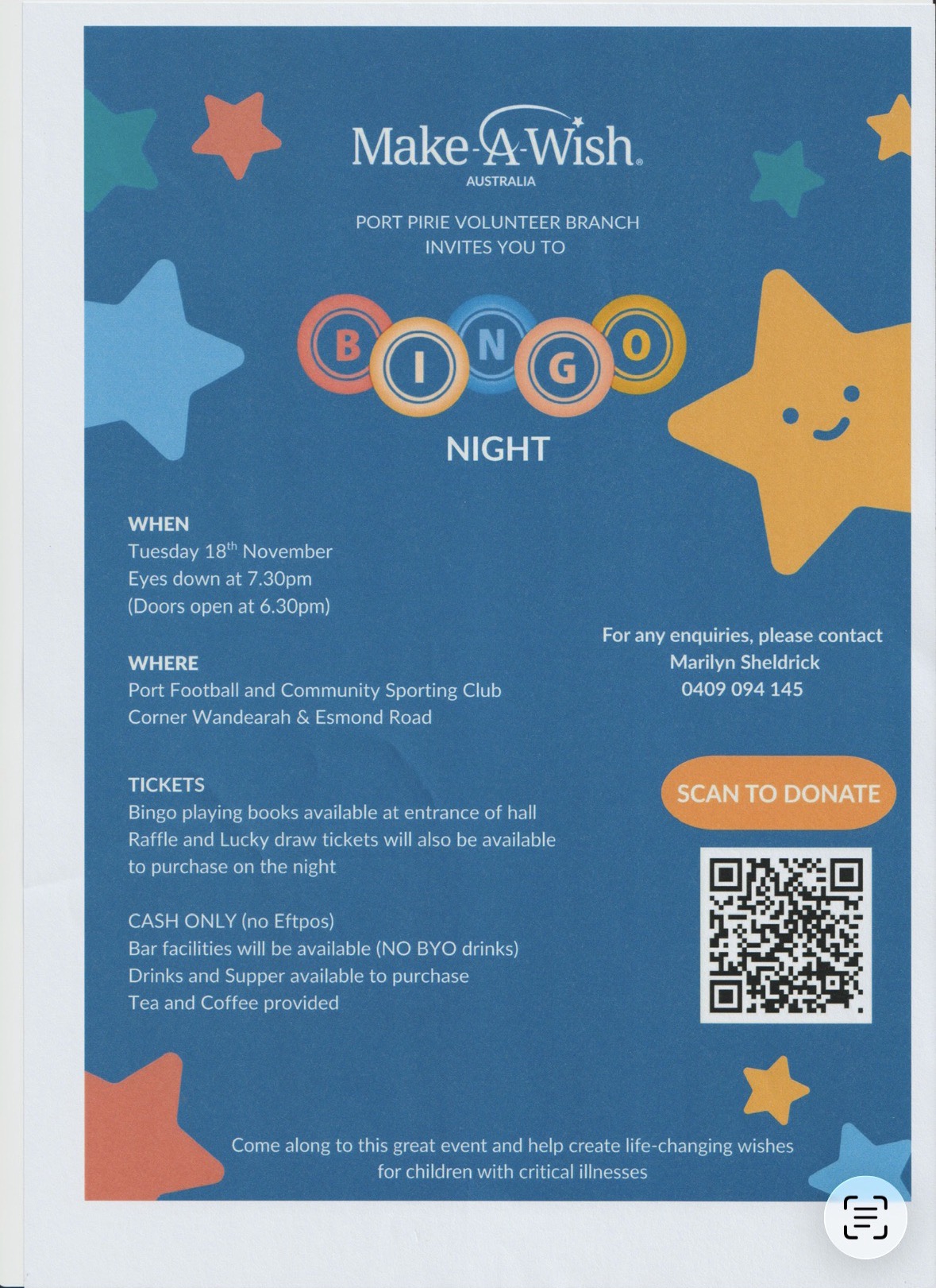 Tuesday 18 November at the Port Football Club on the corner of Esmond and Wandearah Rd, Port Pirie.