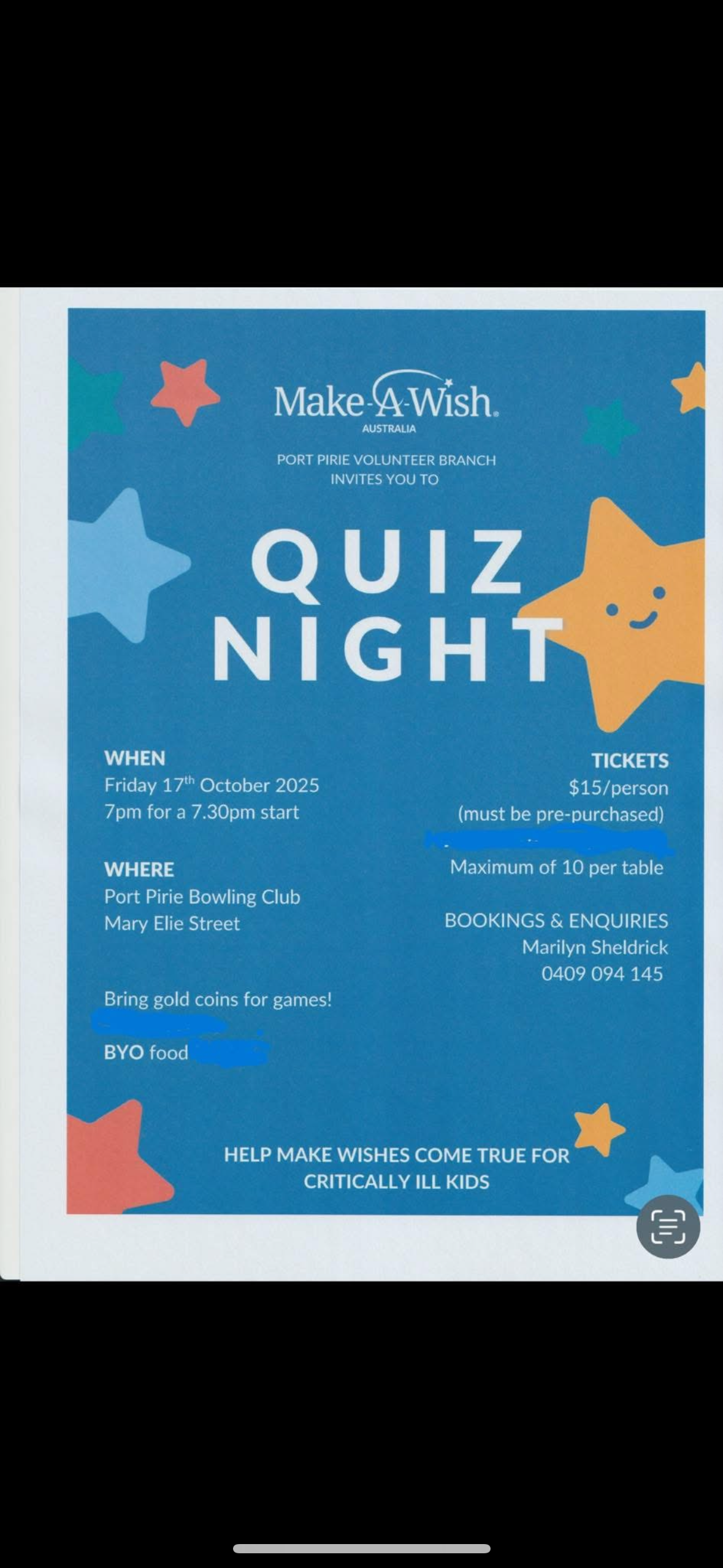 Make-A-Wish Quiz Night – Port Pirie Come and join us for our annual Quiz night. Door prizes and fun for a great cause. Back to Community Events Advertisement Date Oct 17 2025 Expired! Time 7:00 pm - 10:00 pm Cost AUD15.00 More Info Read More Category Community Events Share this event