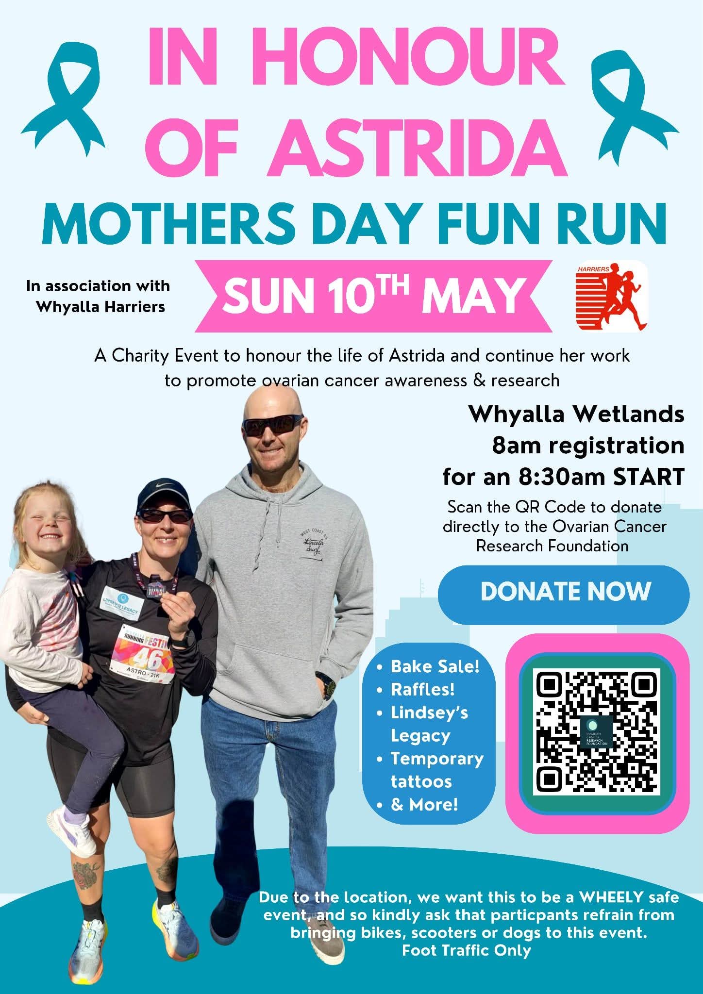 Mothers Day Fun Run in Honour of Astrida Grund. A Charity event to honour the life of Astrida and continue her work to promote Ovarian Cancer awareness and research.