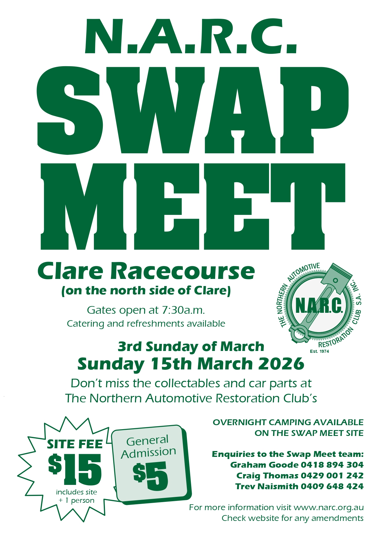 N.A.R.C Swap Meet Clare Sunday 15th of March – Clare Racecourse Gates open at 7.30am Catering and refreshments available Back to Community Events Advertisement Date Mar 15 2026 Expired! Time 7:30 am Cost $5-$15 More Info Read More Category Community Events Share this event