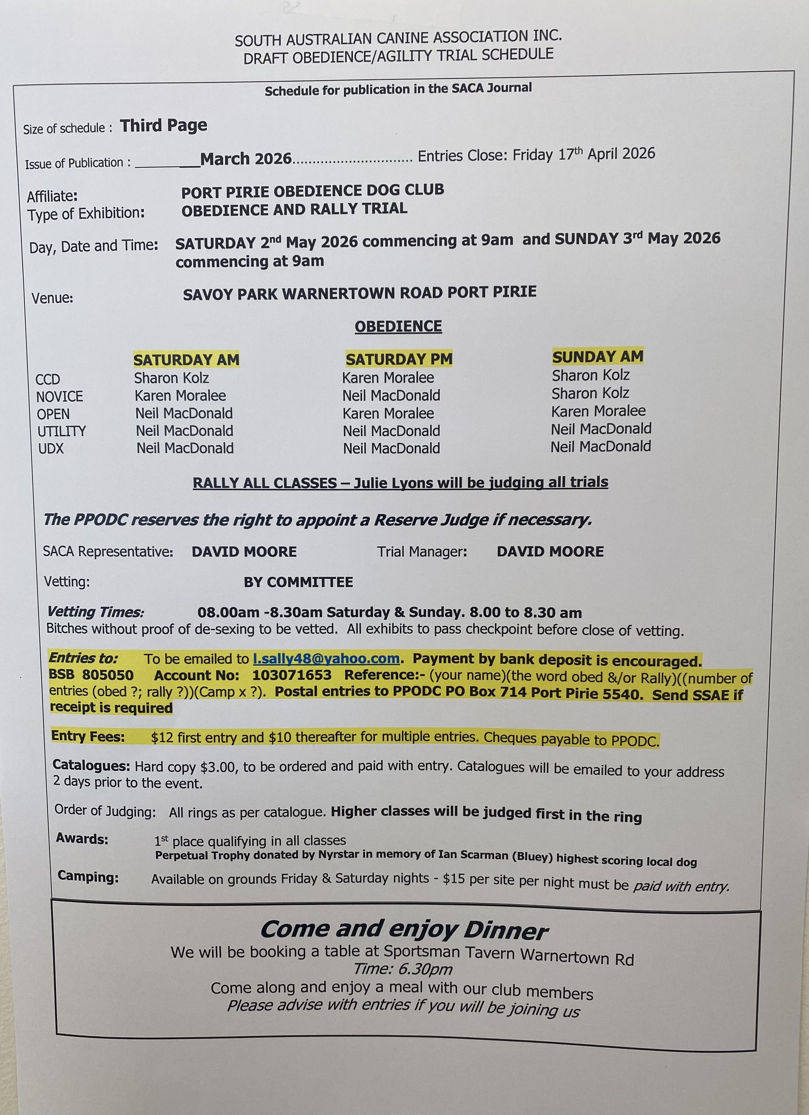 G’day, dog lovers! Don’t miss the Port Pirie Obedience Dog Club’s Obedience and Rally Trial, happening on Saturday 2nd and Sunday 3rd of May 2026 at Savoy Park, Warnertown Road, Port Pirie. Bring the whole family and come along to watch some truly amazing dogs in action as they show off their skills and training. There’ll be a food van on site, plus the amazing Heaven in a cup mixture of coffee/drinks and delicious doughnuts to keep you fuelled throughout the day. Everyone’s welcome – see you there!